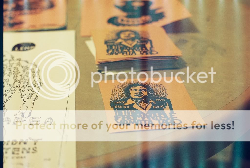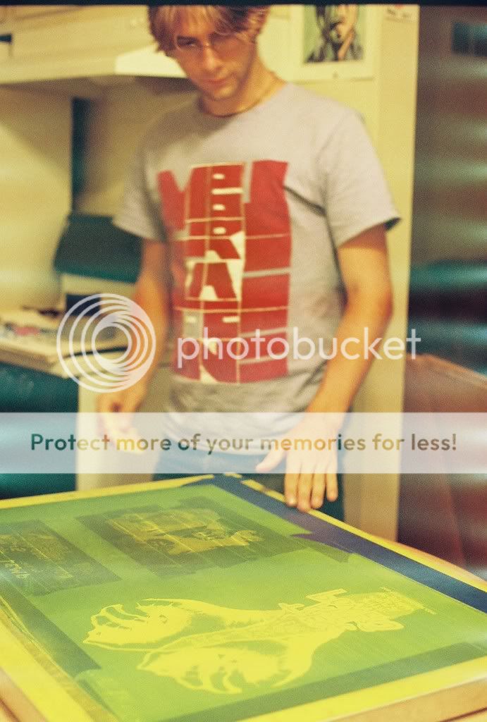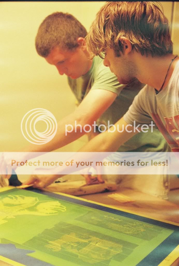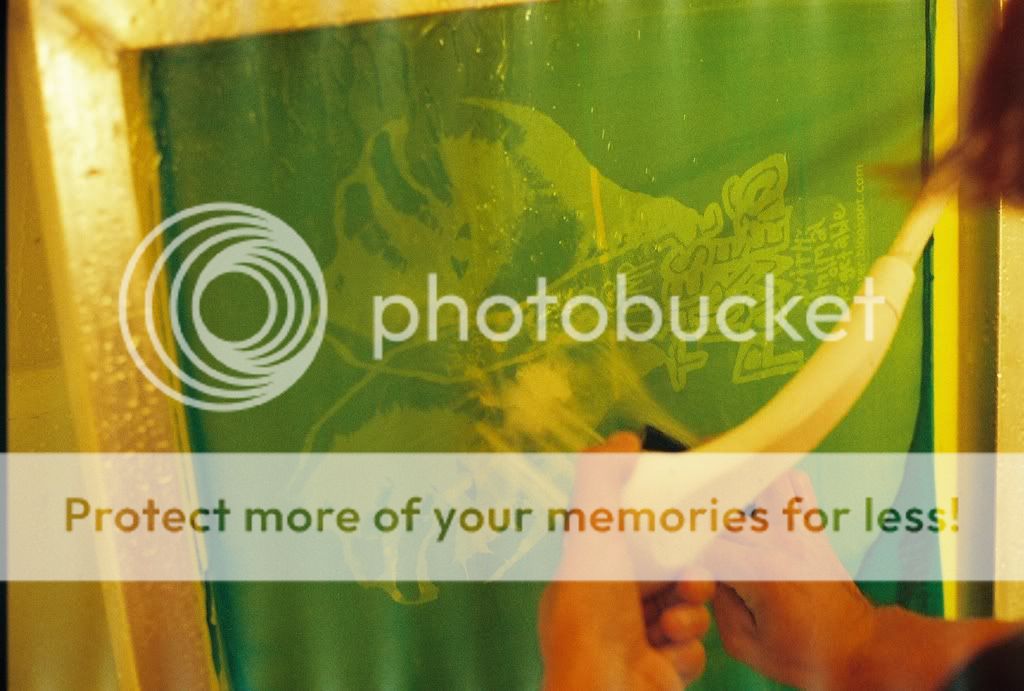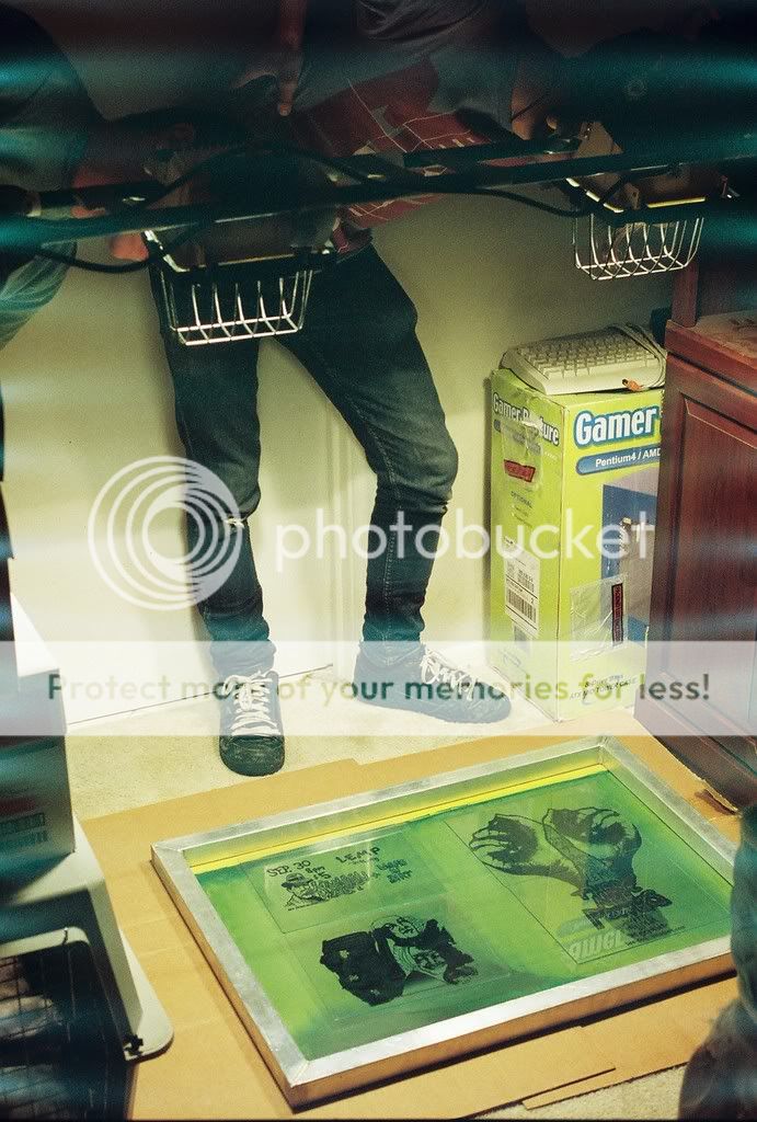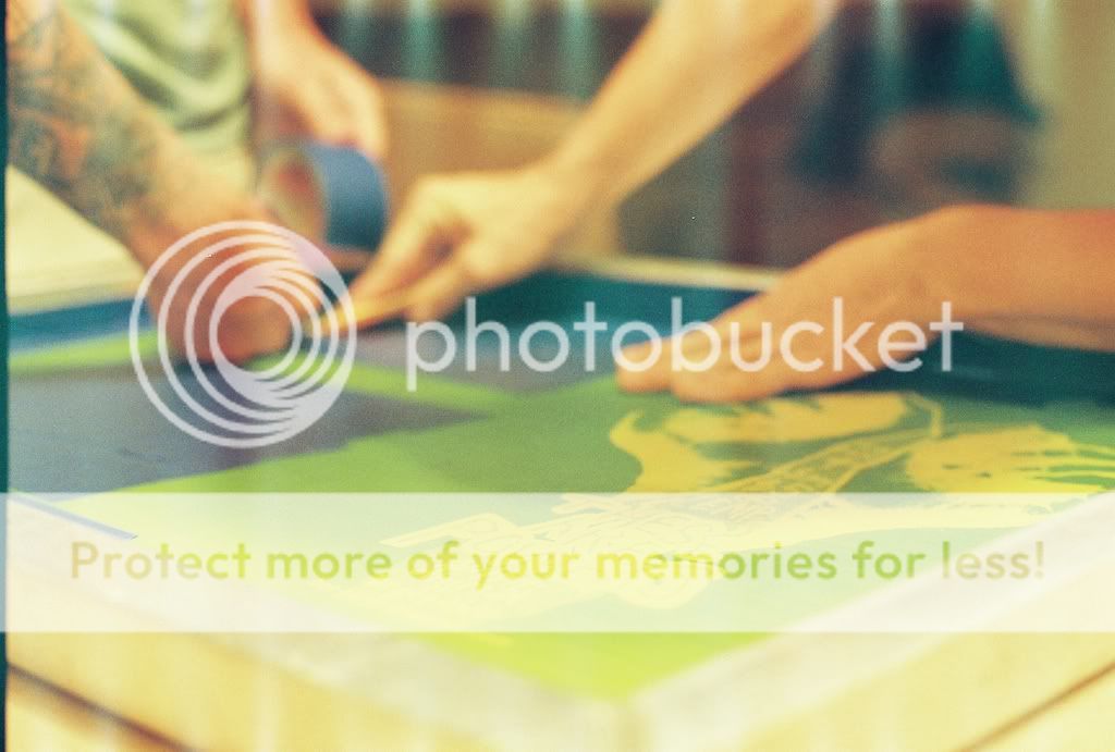Day two and three, we actually go out and buy a cheaper, pre-mixed emulsion and use it instead. Though our screens still look mesy as shit, everything apparently works, and we are able to print flyers for Bellafea, Fromanhole, and Master/Slave. These two nights turn out to be a lot better than the night before.