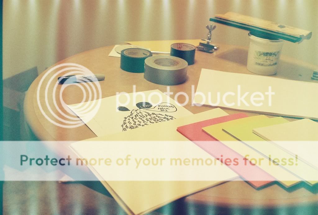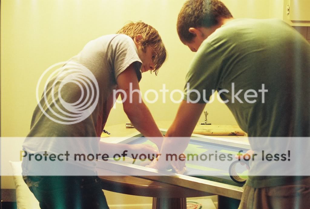 Wrapping it up, we're sitting here waiting for a screen to dry, so we can start printing out the flyers for Human Host, and looking proudly at our stack of These Are Powers flyers. It's been a decent night, even though we ripped one of the hinge clamps right off the fucking table.